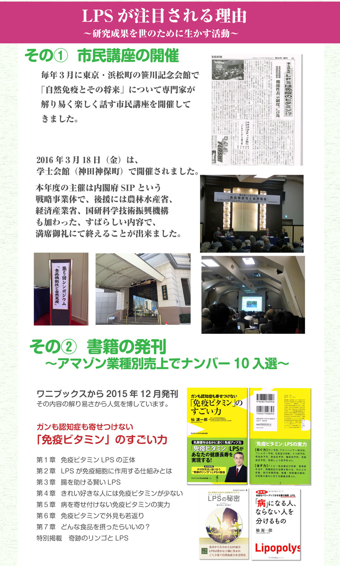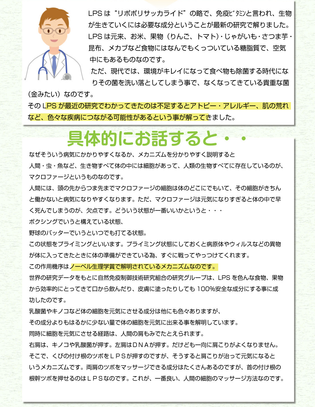 ①LPS リポポリサッカライド 自然免疫制御技術研究組合によるバイオ技術によって、小麦粉単離した液中から有効成分LPSの抽出に成功。「植物発酵LPS」と呼ばれています。 |