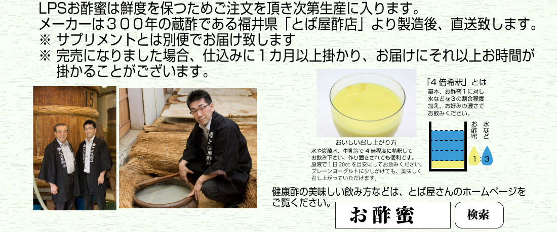 | ■お買い物のご案内 | LPSお酢蜜は鮮度を保つためご注文を頂き次第、生産に入ります。